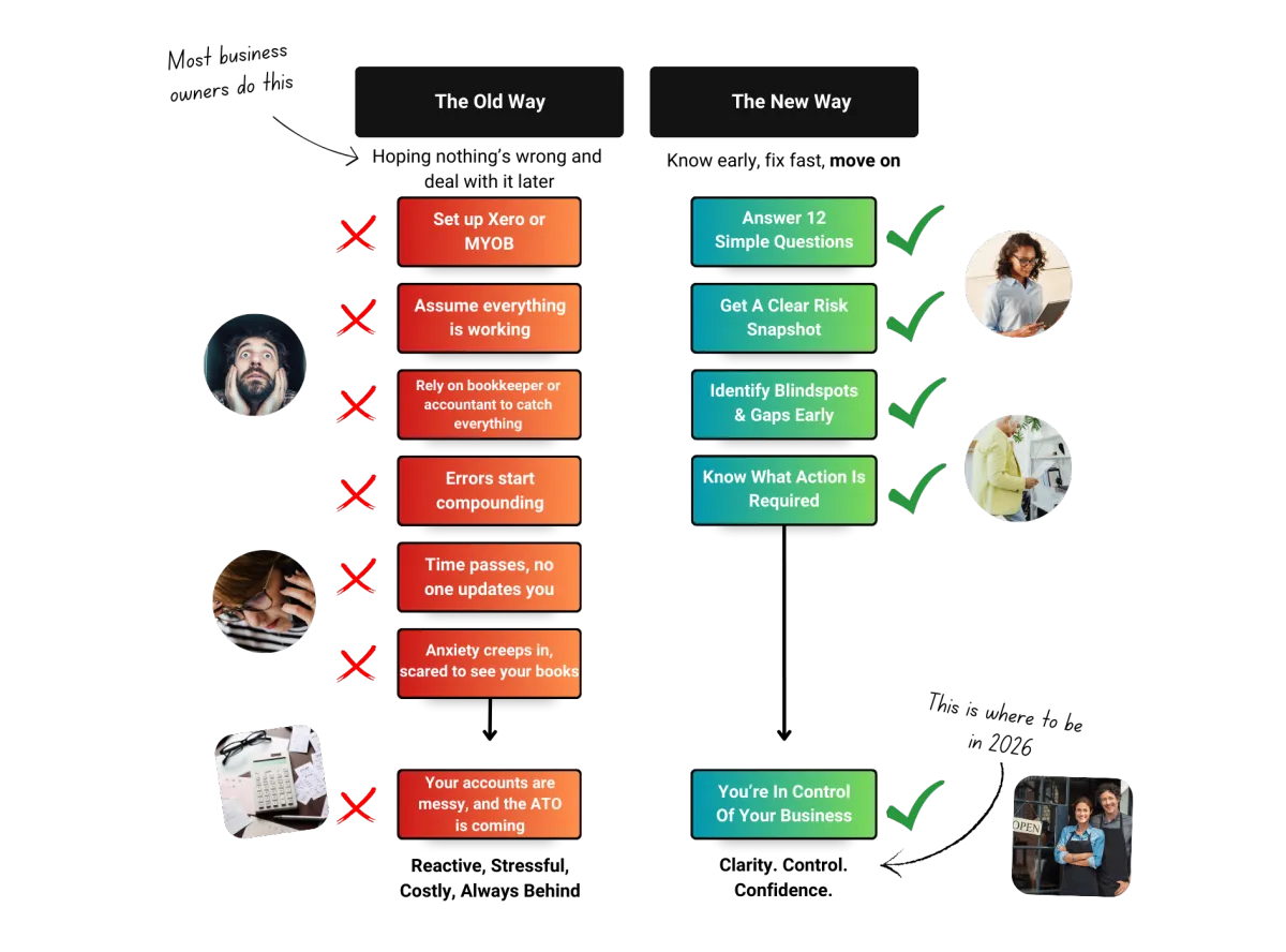 ✅ "Based on your quarterly BAS lodgement and monthly bookkeeper reconciliation, errors are sitting undetected for 60-75 days on average. Here are the three areas where issues are most likely compounding right now."